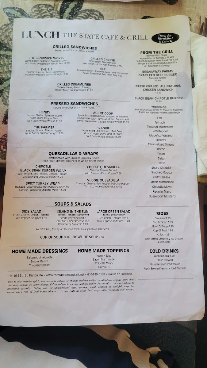 Welcome to The State Cafe and Grill, a hidden gem located at 14-16 S 5th St, Easton, PA. This cozy establishment offers a delightful menu perfect for breakfast and lunch enthusiasts. You can indulge in signature items like the Baby Mama Pancake or the LA Stir Fry, known for its perfectly cooked vegetables and smoky Gouda cheese. Diners rave about the red velvet pancakes topped with chocolate cream cheese frosting, delivering a sweet finish to any meal.